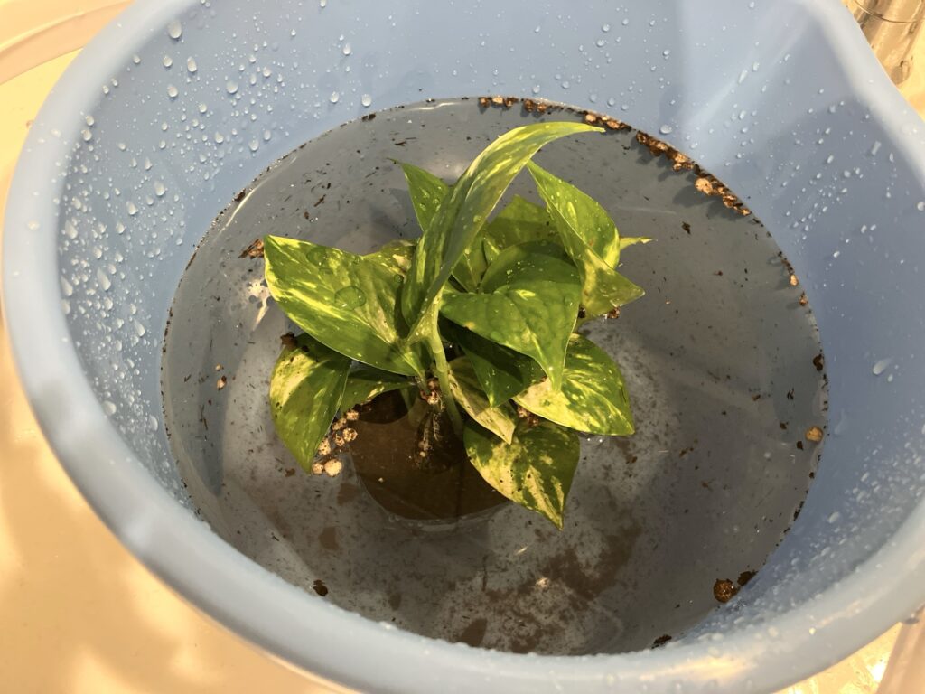 10分ほど水没させて、表面の土が浮いて根が少し見えてしまったので表面部分にだけ土を足しました。