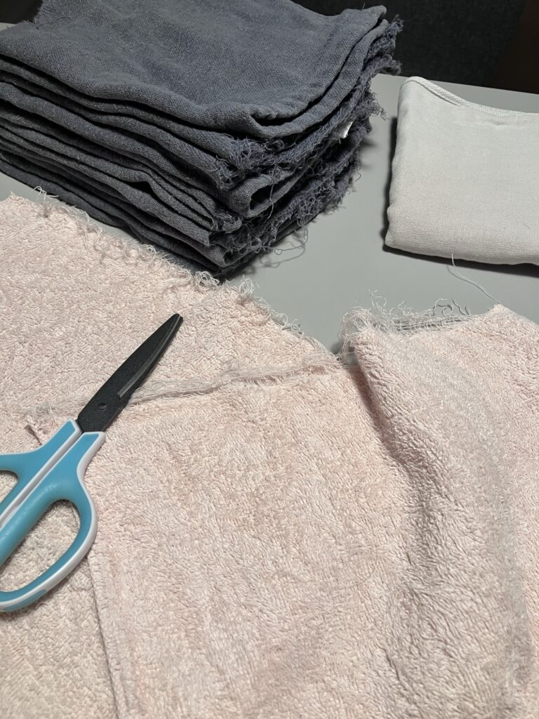 古いタオルを切ってウエスに。びりびり割くのは楽しいけど一気にたくさんやると少し手が痛い。